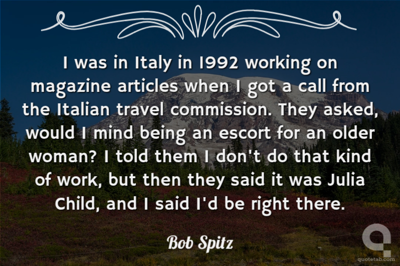 I was in Italy in 1992 working on magazine articles when I got a call from the Italian travel commission. They asked, would I mind being an escort for an older woman? I told them I don't do that kind of work, but then they said it was Julia Child, and I said I'd be right there.