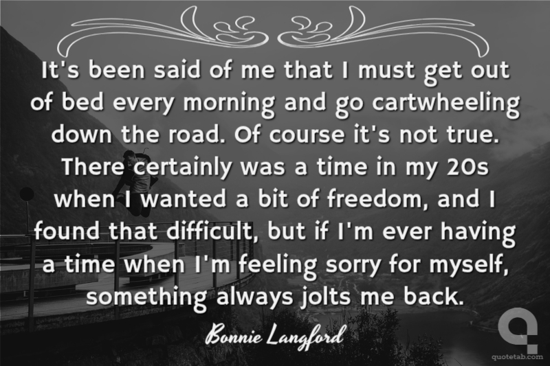 It's been said of me that I must get out of bed every morning and go cartwheeling down the road. Of course it's not true. There certainly was a time in my 20s when I wanted a bit of freedom, and I found that difficult, but if I'm ever having a time when I'm feeling sorry for myself, something always jolts me back.