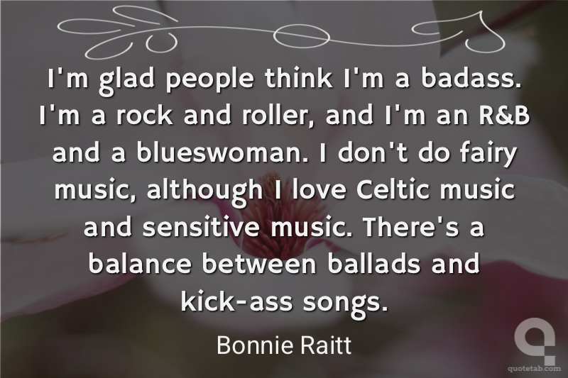 I'm glad people think I'm a badass. I'm a rock and roller, and I'm an R&B and a blueswoman. I don't do fairy music, although I love Celtic music and sensitive music. There's a balance between ballads and kick-ass songs.