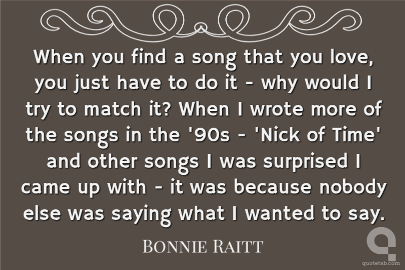 When you find a song that you love, you just have to do it - why would I try to match it? When I wrote more of the songs in the '90s - 'Nick of Time' and other songs I was surprised I came up with - it was because nobody else was saying what I wanted to say.