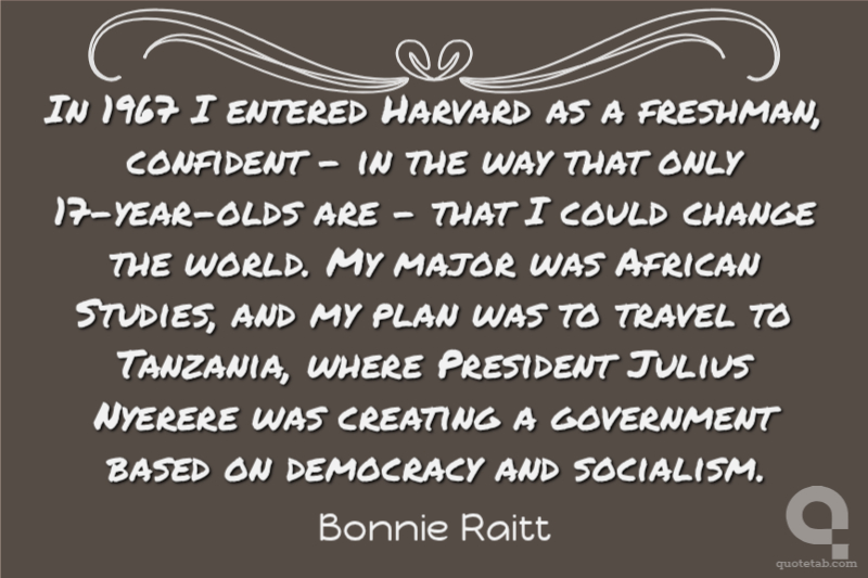In 1967 I entered Harvard as a freshman, confident - in the way that only 17-year-olds are - that I could change the world. My major was African Studies, and my plan was to travel to Tanzania, where President Julius Nyerere was creating a government based on democracy and socialism.