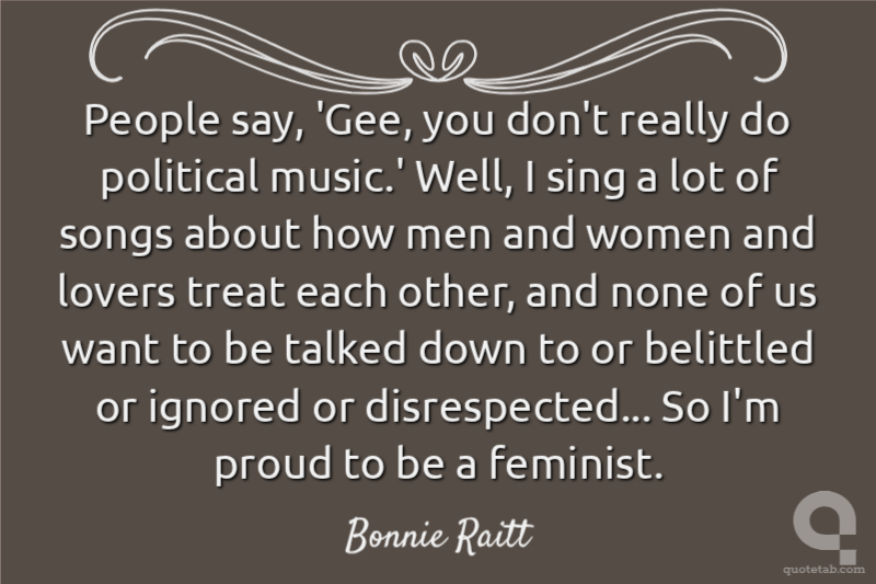 People say, 'Gee, you don't really do political music.' Well, I sing a lot of songs about how men and women and lovers treat each other, and none of us want to be talked down to or belittled or ignored or disrespected... So I'm proud to be a feminist.