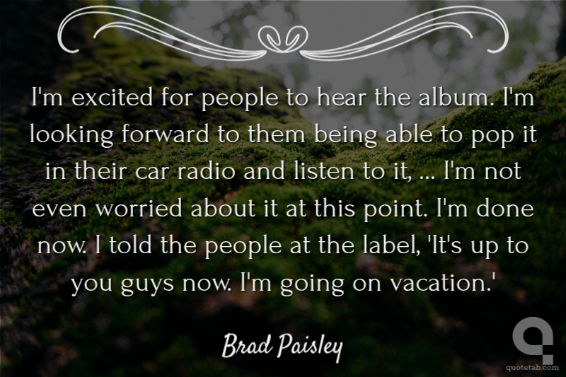I'm excited for people to hear the album. I'm looking forward to them being able to pop it in their car radio and listen to it, ... I'm not even worried about it at this point. I'm done now. I told the people at the label, 'It's up to you guys now. I'm going on vacation.'