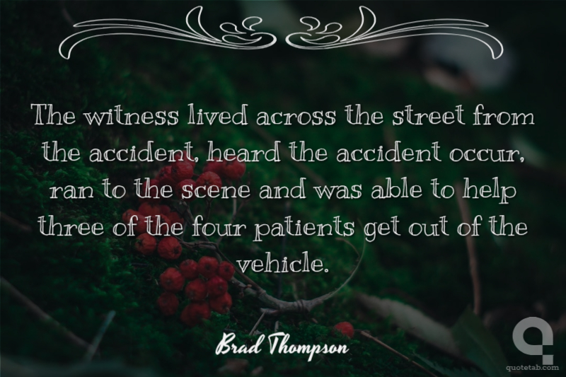 The witness lived across the street from the accident, heard the accident occur, ran to the scene and was able to help three of the four patients get out of the vehicle.