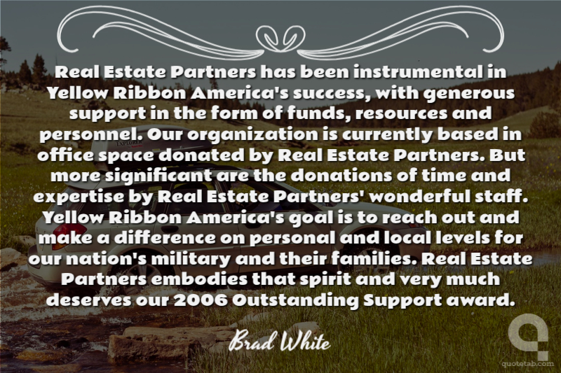 Real Estate Partners has been instrumental in Yellow Ribbon America's success, with generous support in the form of funds, resources and personnel. Our organization is currently based in office space donated by Real Estate Partners. But more significant are the donations of time and expertise by Real Estate Partners' wonderful staff. Yellow Ribbon America's goal is to reach out and make a difference on personal and local levels for our nation's military and their families. Real Estate Partners embodies that spirit and very much deserves our 2006 Outstanding Support award.