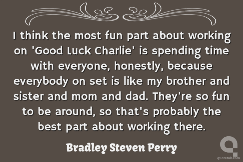 I think the most fun part about working on 'Good Luck Charlie' is spending time with everyone, honestly, because everybody on set is like my brother and sister and mom and dad. They're so fun to be around, so that's probably the best part about working there.