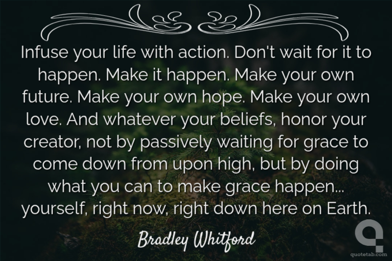 Infuse your life with action. Don't wait for it to happen. Make it happen. Make your own future. Make your own hope. Make your own love. And whatever your beliefs, honor your creator, not by passively waiting for grace to come down from upon high, but by doing what you can to make grace happen... yourself, right now, right down here on Earth.