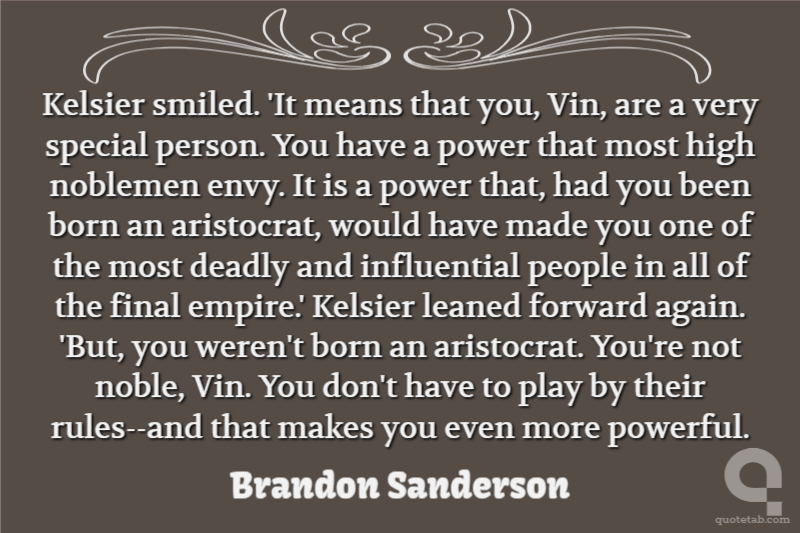 Kelsier smiled. 'It means that you, Vin, are a very special person. You have a power that most high noblemen envy. It is a power that, had you been born an aristocrat, would have made you one of the most deadly and influential people in all of the final empire.' Kelsier leaned forward again. 'But, you weren't born an aristocrat. You're not noble, Vin. You don't have to play by their rules--and that makes you even more powerful.