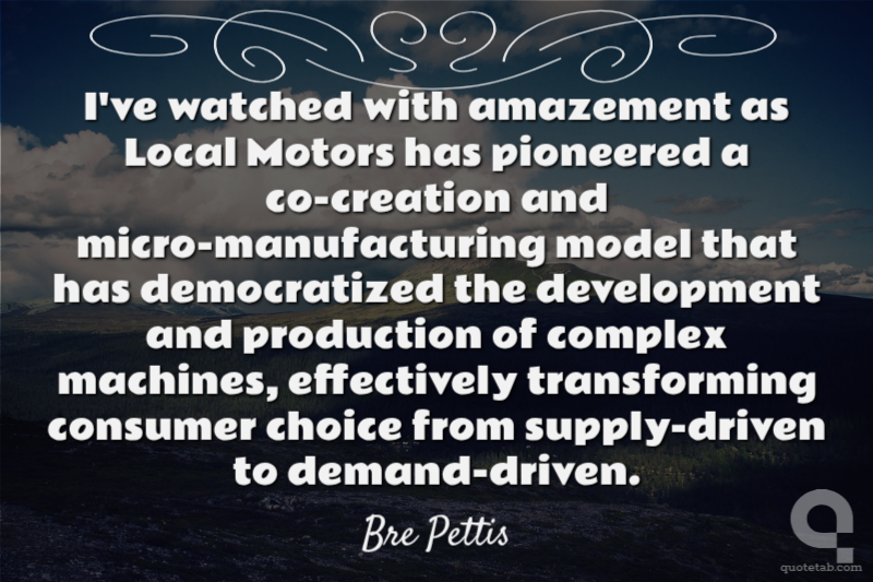 I've watched with amazement as Local Motors has pioneered a co-creation and micro-manufacturing model that has democratized the development and production of complex machines, effectively transforming consumer choice from supply-driven to demand-driven.