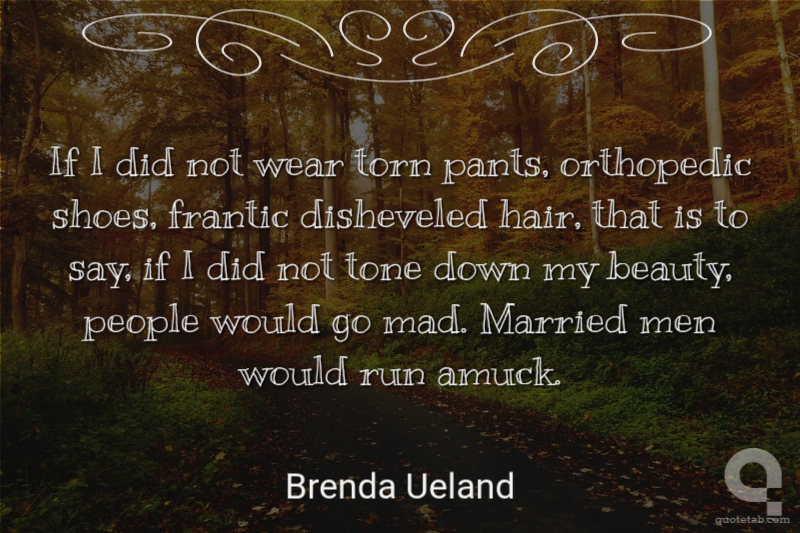 If I did not wear torn pants, orthopedic shoes, frantic disheveled hair, that is to say, if I did not tone down my beauty, people would go mad. Married men would run amuck.