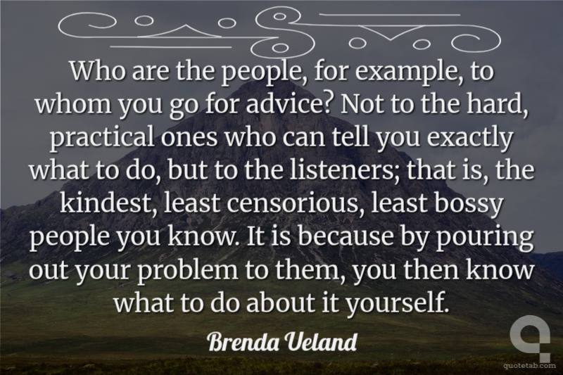 Who are the people, for example, to whom you go for advice? Not to the hard, practical ones who can tell you exactly what to do, but to the listeners; that is, the kindest, least censorious, least bossy people you know. It is because by pouring out your problem to them, you then know what to do about it yourself.