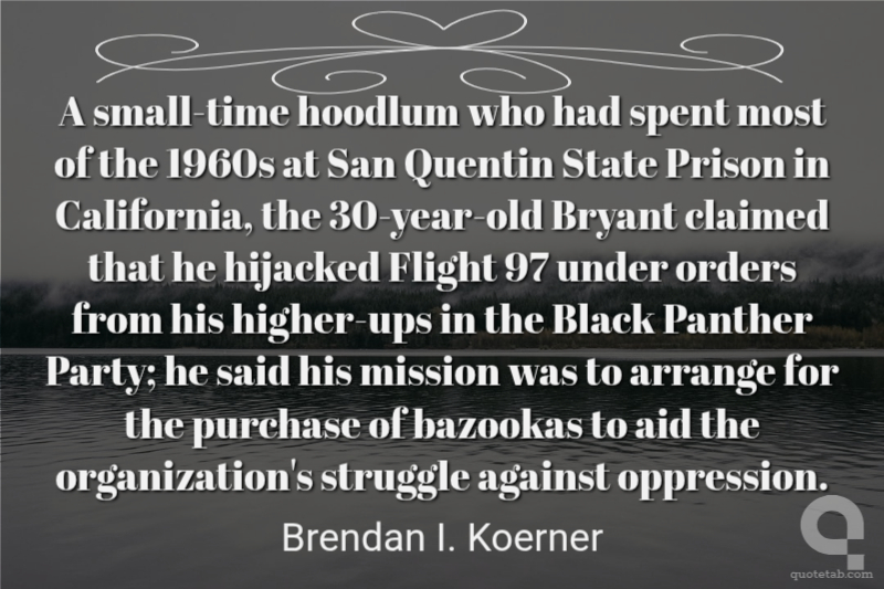 A small-time hoodlum who had spent most of the 1960s at San Quentin State Prison in California, the 30-year-old Bryant claimed that he hijacked Flight 97 under orders from his higher-ups in the Black Panther Party; he said his mission was to arrange for the purchase of bazookas to aid the organization's struggle against oppression.