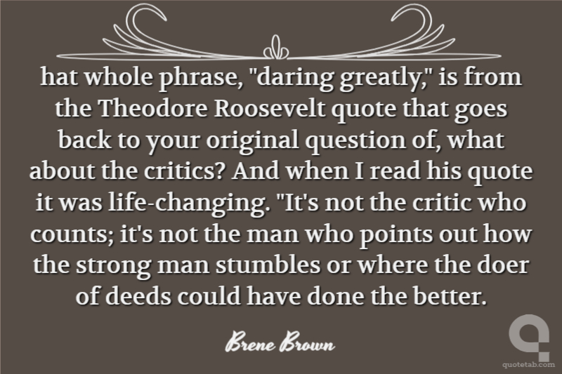 hat whole phrase, "daring greatly," is from the Theodore Roosevelt quote that goes back to your original question of, what about the critics? And when I read his quote it was life-changing. "It's not the critic who counts; it's not the man who points out how the strong man stumbles or where the doer of deeds could have done the better.