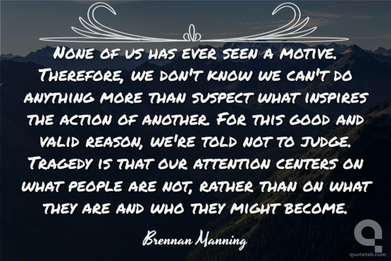 None of us has ever seen a motive. Therefore, we don't know we can't do anything more than suspect what inspires the action of another. For this good and valid reason, we're told not to judge. Tragedy is that our attention centers on what people are not, rather than on what they are and who they might become.