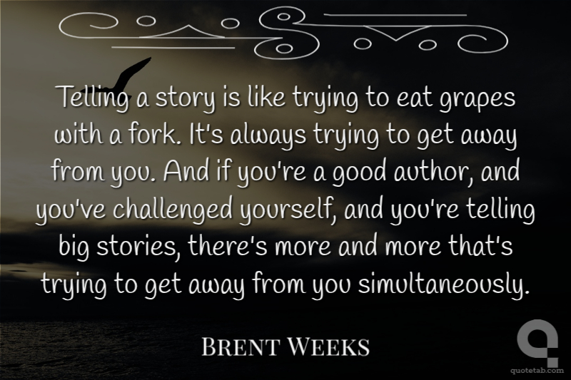 Telling a story is like trying to eat grapes with a fork. It's always trying to get away from you. And if you're a good author, and you've challenged yourself, and you're telling big stories, there's more and more that's trying to get away from you simultaneously.