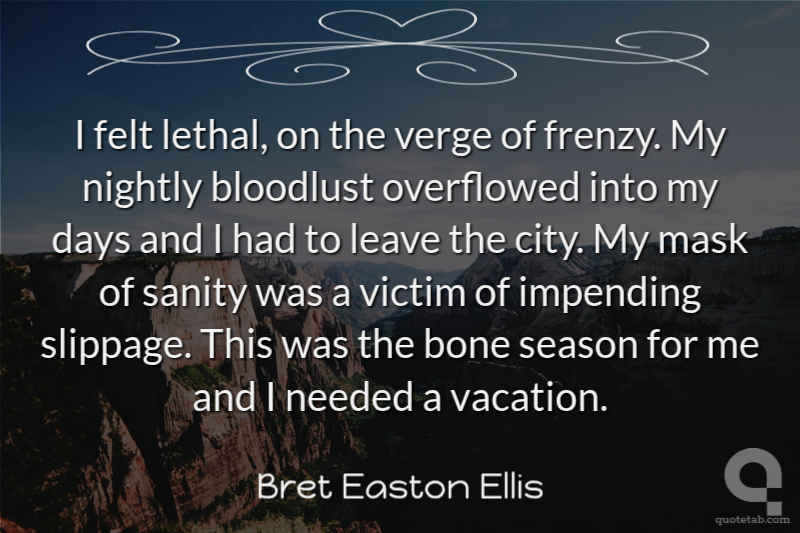 I felt lethal, on the verge of frenzy. My nightly bloodlust overflowed into my days and I had to leave the city. My mask of sanity was a victim of impending slippage. This was the bone season for me and I needed a vacation.