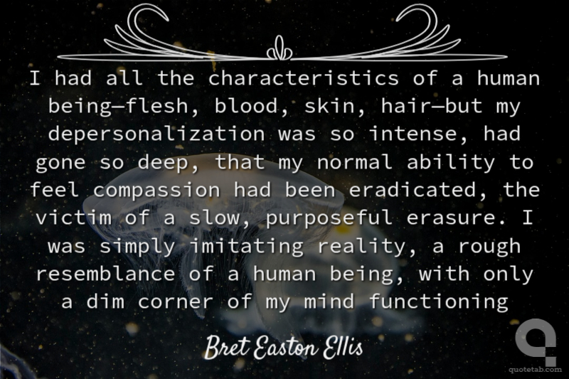 I had all the characteristics of a human being—flesh, blood, skin, hair—but my depersonalization was so intense, had gone so deep, that my normal ability to feel compassion had been eradicated, the victim of a slow, purposeful erasure. I was simply imitating reality, a rough resemblance of a human being, with only a dim corner of my mind functioning