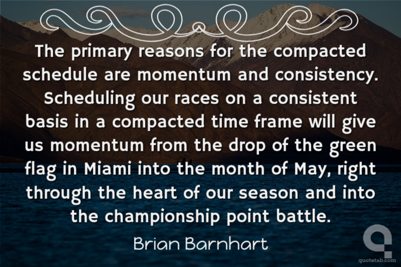 The primary reasons for the compacted schedule are momentum and consistency. Scheduling our races on a consistent basis in a compacted time frame will give us momentum from the drop of the green flag in Miami into the month of May, right through the heart of our season and into the championship point battle.