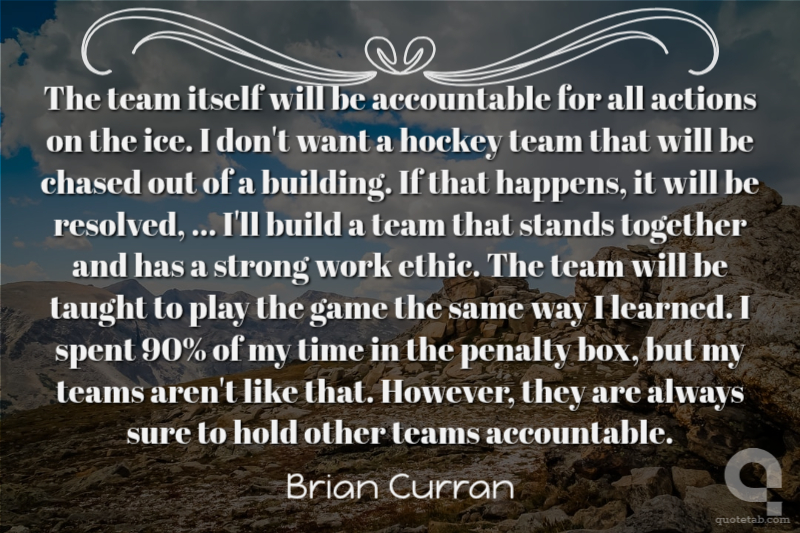 The team itself will be accountable for all actions on the ice. I don't want a hockey team that will be chased out of a building. If that happens, it will be resolved, ... I'll build a team that stands together and has a strong work ethic. The team will be taught to play the game the same way I learned. I spent 90% of my time in the penalty box, but my teams aren't like that. However, they are always sure to hold other teams accountable.