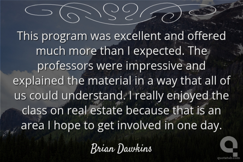 This program was excellent and offered much more than I expected. The professors were impressive and explained the material in a way that all of us could understand. I really enjoyed the class on real estate because that is an area I hope to get involved in one day.