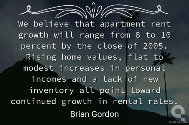 We believe that apartment rent growth will range from 8 to 10 percent by the close of 2005. Rising home values, flat to modest increases in personal incomes and a lack of new inventory all point toward continued growth in rental rates.