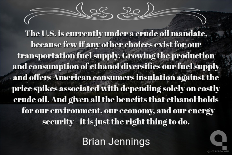The U.S. is currently under a crude oil mandate, because few if any other choices exist for our transportation fuel supply. Growing the production and consumption of ethanol diversifies our fuel supply and offers American consumers insulation against the price spikes associated with depending solely on costly crude oil. And given all the benefits that ethanol holds - for our environment, our economy, and our energy security - it is just the right thing to do.