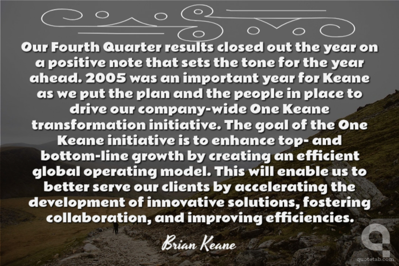 Our Fourth Quarter results closed out the year on a positive note that sets the tone for the year ahead. 2005 was an important year for Keane as we put the plan and the people in place to drive our company-wide One Keane transformation initiative. The goal of the One Keane initiative is to enhance top- and bottom-line growth by creating an efficient global operating model. This will enable us to better serve our clients by accelerating the development of innovative solutions, fostering collaboration, and improving efficiencies.