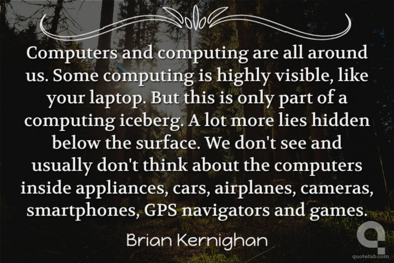 Computers and computing are all around us. Some computing is highly visible, like your laptop. But this is only part of a computing iceberg. A lot more lies hidden below the surface. We don't see and usually don't think about the computers inside appliances, cars, airplanes, cameras, smartphones, GPS navigators and games.