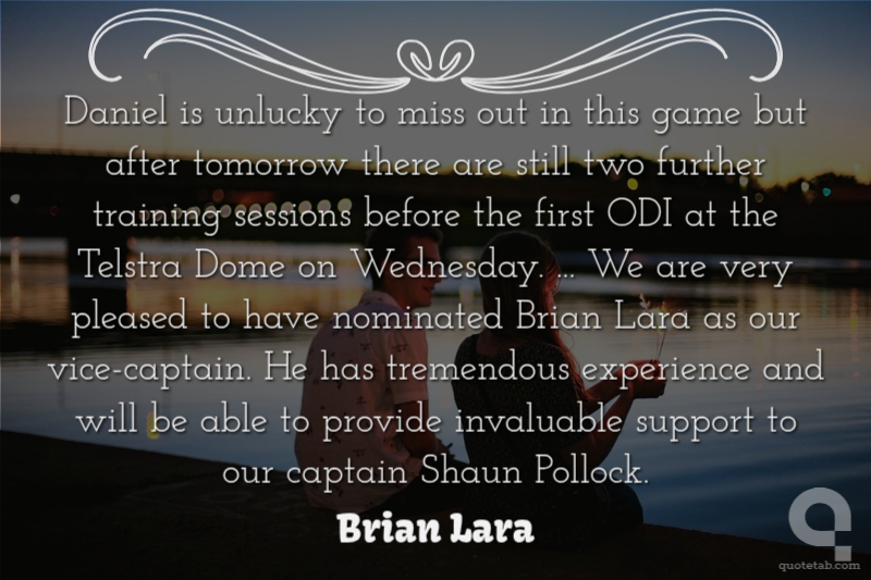 Daniel is unlucky to miss out in this game but after tomorrow there are still two further training sessions before the first ODI at the Telstra Dome on Wednesday. ... We are very pleased to have nominated Brian Lara as our vice-captain. He has tremendous experience and will be able to provide invaluable support to our captain Shaun Pollock.
