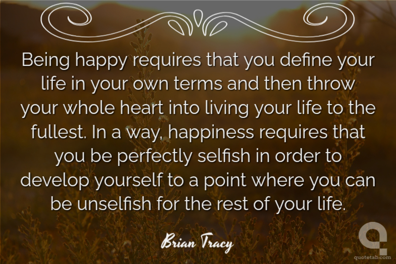Being happy requires that you define your life in your own terms and then throw your whole heart into living your life to the fullest. In a way, happiness requires that you be perfectly selfish in order to develop yourself to a point where you can be unselfish for the rest of your life.