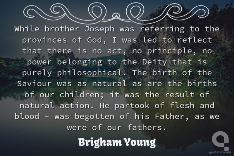 While brother Joseph was referring to the provinces of God, I was led to reflect that there is no act, no principle, no power belonging to the Deity that is purely philosophical. The birth of the Saviour was as natural as are the births of our children; it was the result of natural action. He partook of flesh and blood - was begotten of his Father, as we were of our fathers.