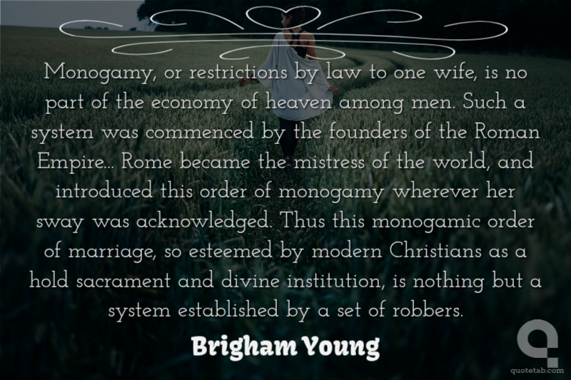 Monogamy, or restrictions by law to one wife, is no part of the economy of heaven among men. Such a system was commenced by the founders of the Roman Empire... Rome became the mistress of the world, and introduced this order of monogamy wherever her sway was acknowledged. Thus this monogamic order of marriage, so esteemed by modern Christians as a hold sacrament and divine institution, is nothing but a system established by a set of robbers.
