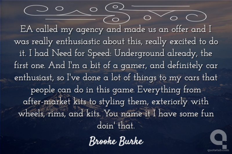EA called my agency and made us an offer and I was really enthusiastic about this, really excited to do it. I had Need for Speed: Underground already, the first one. And I'm a bit of a gamer, and definitely car enthusiast, so I've done a lot of things to my cars that people can do in this game. Everything from after-market kits to styling them, exteriorly with wheels, rims, and kits. You name it I have some fun doin' that.