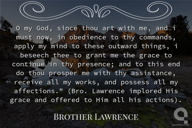 O my God, since thou art with me, and i must now, in obedience to thy commands, apply my mind to these outward things, i beseech thee to grant me the grace to continue in thy presence; and to this end do thou prosper me with thy assistance, receive all my works, and possess all my affections." (Bro. Lawrence implored His grace and offered to Him all his actions).