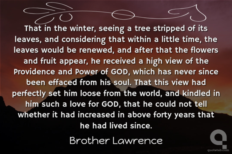 That in the winter, seeing a tree stripped of its leaves, and considering that within a little time, the leaves would be renewed, and after that the flowers and fruit appear, he received a high view of the Providence and Power of GOD, which has never since been effaced from his soul. That this view had perfectly set him loose from the world, and kindled in him such a love for GOD, that he could not tell whether it had increased in above forty years that he had lived since.