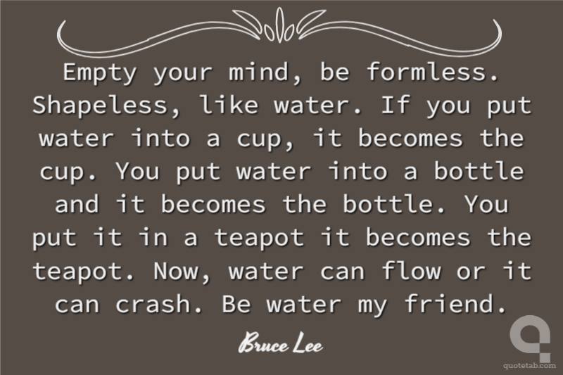 Empty your mind, be formless. Shapeless, like water. If you put water into a cup, it becomes the cup. You put water into a bottle and it becomes the bottle. You put it in a teapot it becomes the teapot. Now, water can flow or it can crash. Be water my friend.