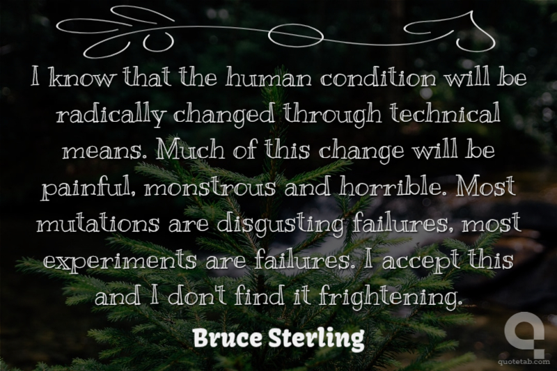 I know that the human condition will be radically changed through technical means. Much of this change will be painful, monstrous and horrible. Most mutations are disgusting failures, most experiments are failures. I accept this and I don't find it frightening.