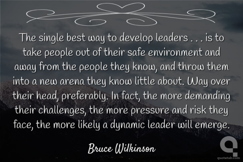 The single best way to develop leaders . . . is to take people out of their safe environment and away from the people they know, and throw them into a new arena they know little about. Way over their head, preferably. In fact, the more demanding their challenges, the more pressure and risk they face, the more likely a dynamic leader will emerge.