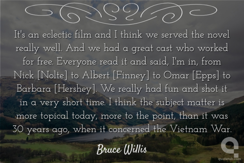 It's an eclectic film and I think we served the novel really well. And we had a great cast who worked for free. Everyone read it and said, I'm in, from Nick [Nolte] to Albert [Finney] to Omar [Epps] to Barbara [Hershey]. We really had fun and shot it in a very short time. I think the subject matter is more topical today, more to the point, than it was 30 years ago, when it concerned the Vietnam War.