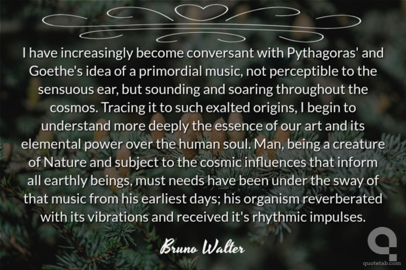 I have increasingly become conversant with Pythagoras' and Goethe's idea of a primordial music, not perceptible to the sensuous ear, but sounding and soaring throughout the cosmos. Tracing it to such exalted origins, I begin to understand more deeply the essence of our art and its elemental power over the human soul. Man, being a creature of Nature and subject to the cosmic influences that inform all earthly beings, must needs have been under the sway of that music from his earliest days; his organism reverberated with its vibrations and received it's rhythmic impulses.