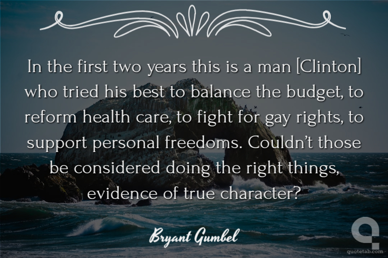 In the first two years this is a man [Clinton] who tried his best to balance the budget, to reform health care, to fight for gay rights, to support personal freedoms. Couldn’t those be considered doing the right things, evidence of true character?