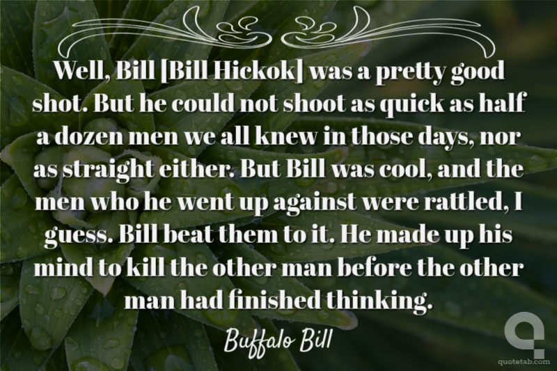 Well, Bill [Bill Hickok] was a pretty good shot. But he could not shoot as quick as half a dozen men we all knew in those days, nor as straight either. But Bill was cool, and the men who he went up against were rattled, I guess. Bill beat them to it. He made up his mind to kill the other man before the other man had finished thinking.