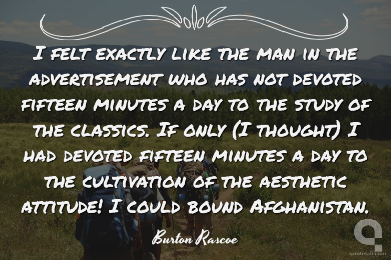I felt exactly like the man in the advertisement who has not devoted fifteen minutes a day to the study of the classics. If only (I thought) I had devoted fifteen minutes a day to the cultivation of the aesthetic attitude! I could bound Afghanistan.