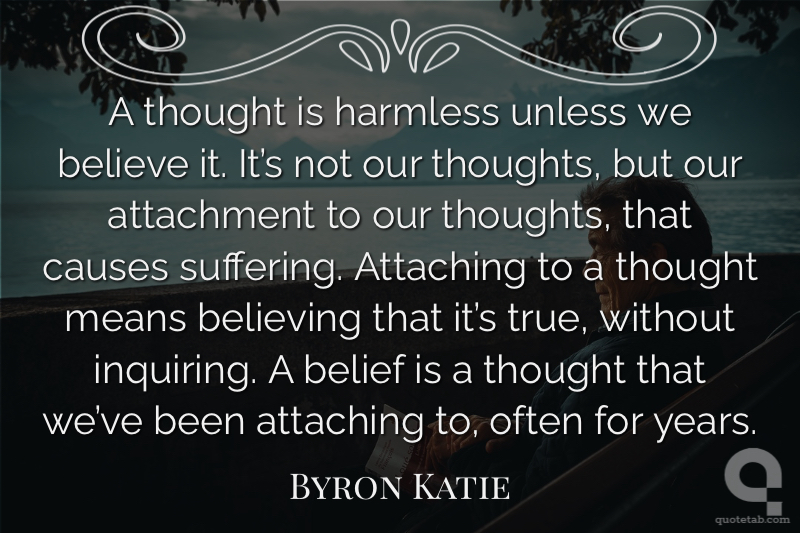 A thought is harmless unless we believe it. It’s not our thoughts, but our attachment to our thoughts, that causes suffering. Attaching to a thought means believing that it’s true, without inquiring. A belief is a thought that we’ve been attaching to, often for years.