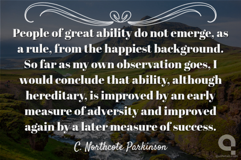 People of great ability do not emerge, as a rule, from the happiest background. So far as my own observation goes, I would conclude that ability, although hereditary, is improved by an early measure of adversity and improved again by a later measure of success.