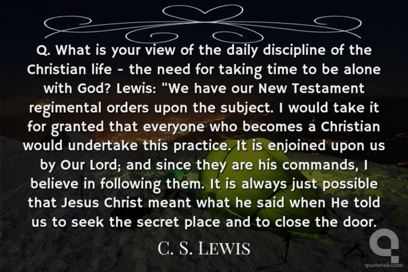 Q. What is your view of the daily discipline of the Christian life - the need for taking time to be alone with God? Lewis: "We have our New Testament regimental orders upon the subject. I would take it for granted that everyone who becomes a Christian would undertake this practice. It is enjoined upon us by Our Lord; and since they are his commands, I believe in following them. It is always just possible that Jesus Christ meant what he said when He told us to seek the secret place and to close the door.