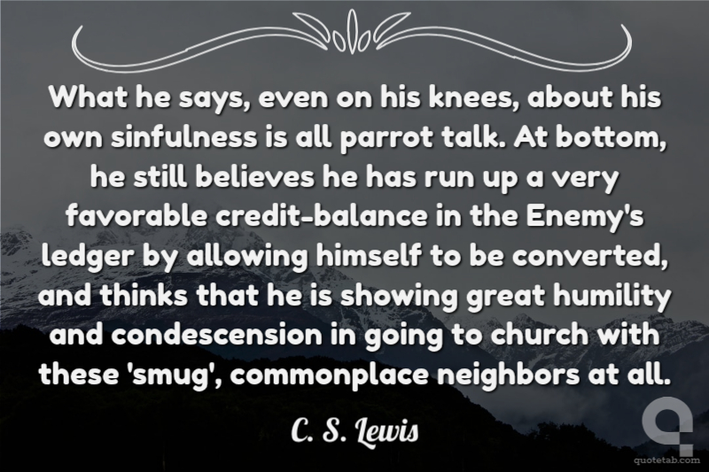 What he says, even on his knees, about his own sinfulness is all parrot talk. At bottom, he still believes he has run up a very favorable credit-balance in the Enemy's ledger by allowing himself to be converted, and thinks that he is showing great humility and condescension in going to church with these 'smug', commonplace neighbors at all.