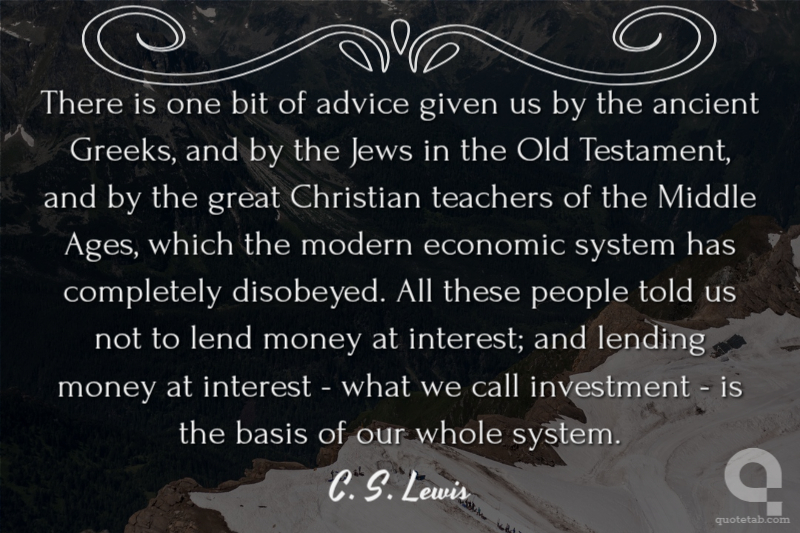 There is one bit of advice given us by the ancient Greeks, and by the Jews in the Old Testament, and by the great Christian teachers of the Middle Ages, which the modern economic system has completely disobeyed. All these people told us not to lend money at interest; and lending money at interest - what we call investment - is the basis of our whole system.