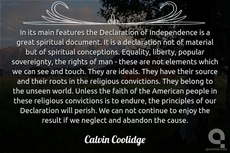 In its main features the Declaration of Independence is a great spiritual document. It is a declaration not of material but of spiritual conceptions. Equality, liberty, popular sovereignty, the rights of man - these are not elements which we can see and touch. They are ideals. They have their source and their roots in the religious convictions. They belong to the unseen world. Unless the faith of the American people in these religious convictions is to endure, the principles of our Declaration will perish. We can not continue to enjoy the result if we neglect and abandon the cause.