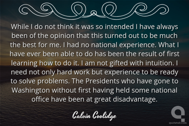 While I do not think it was so intended I have always been of the opinion that this turned out to be much the best for me. I had no national experience. What I have ever been able to do has been the result of first learning how to do it. I am not gifted with intuition. I need not only hard work but experience to be ready to solve problems. The Presidents who have gone to Washington without first having held some national office have been at great disadvantage.